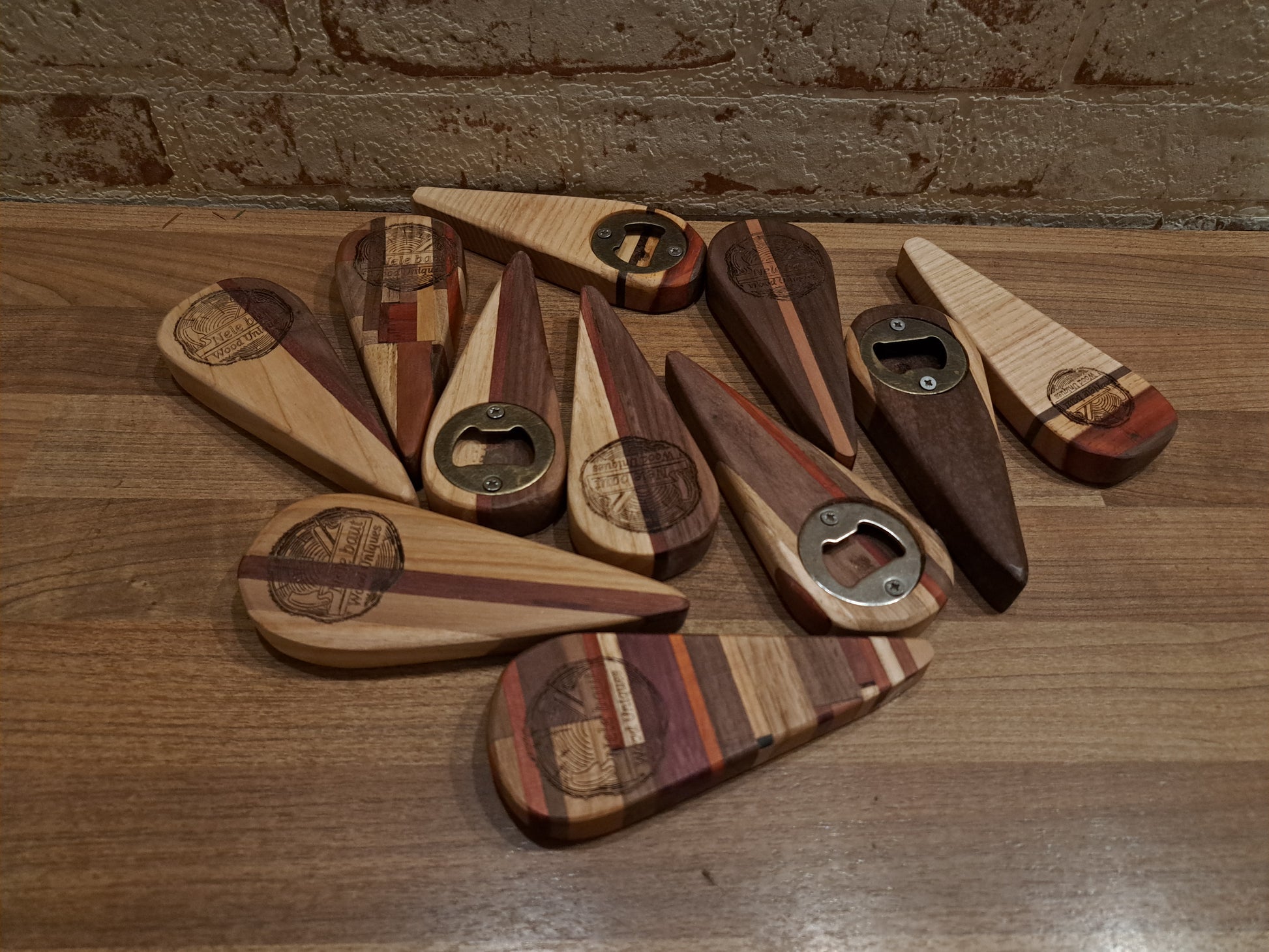 Diese Flaschenöffner sind aus verschiedenen Resthölzern gefertigt, denn kein Holz ist zum Entsorgen gut genug!
