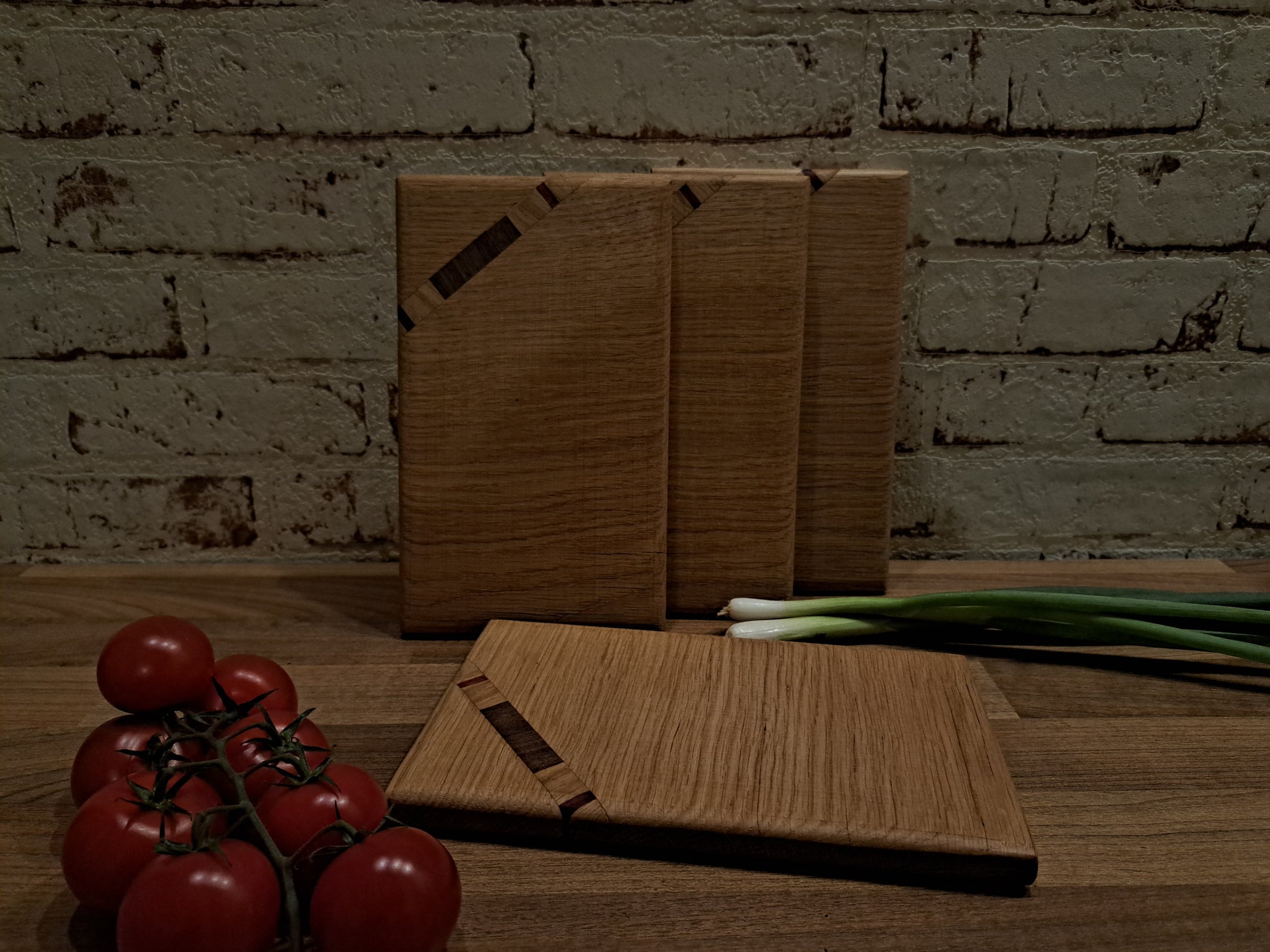 Frühstücksbrettchen aus Eiche mit Akzenten in der Ecke aus amerikanischer Blacknut Schwarznuss und Padouk