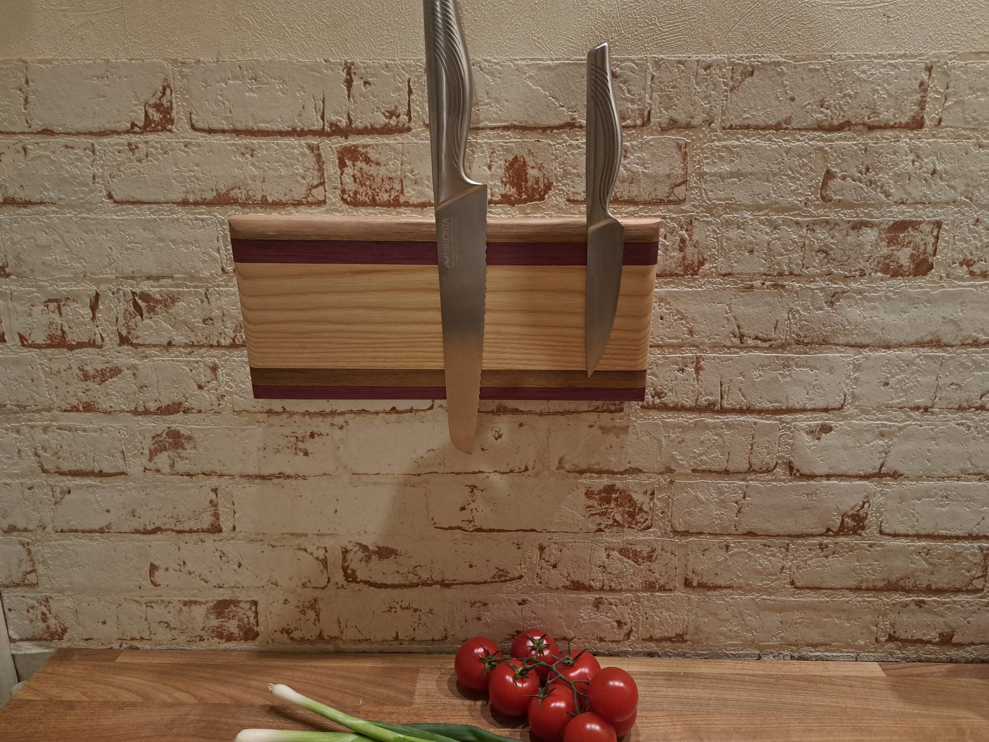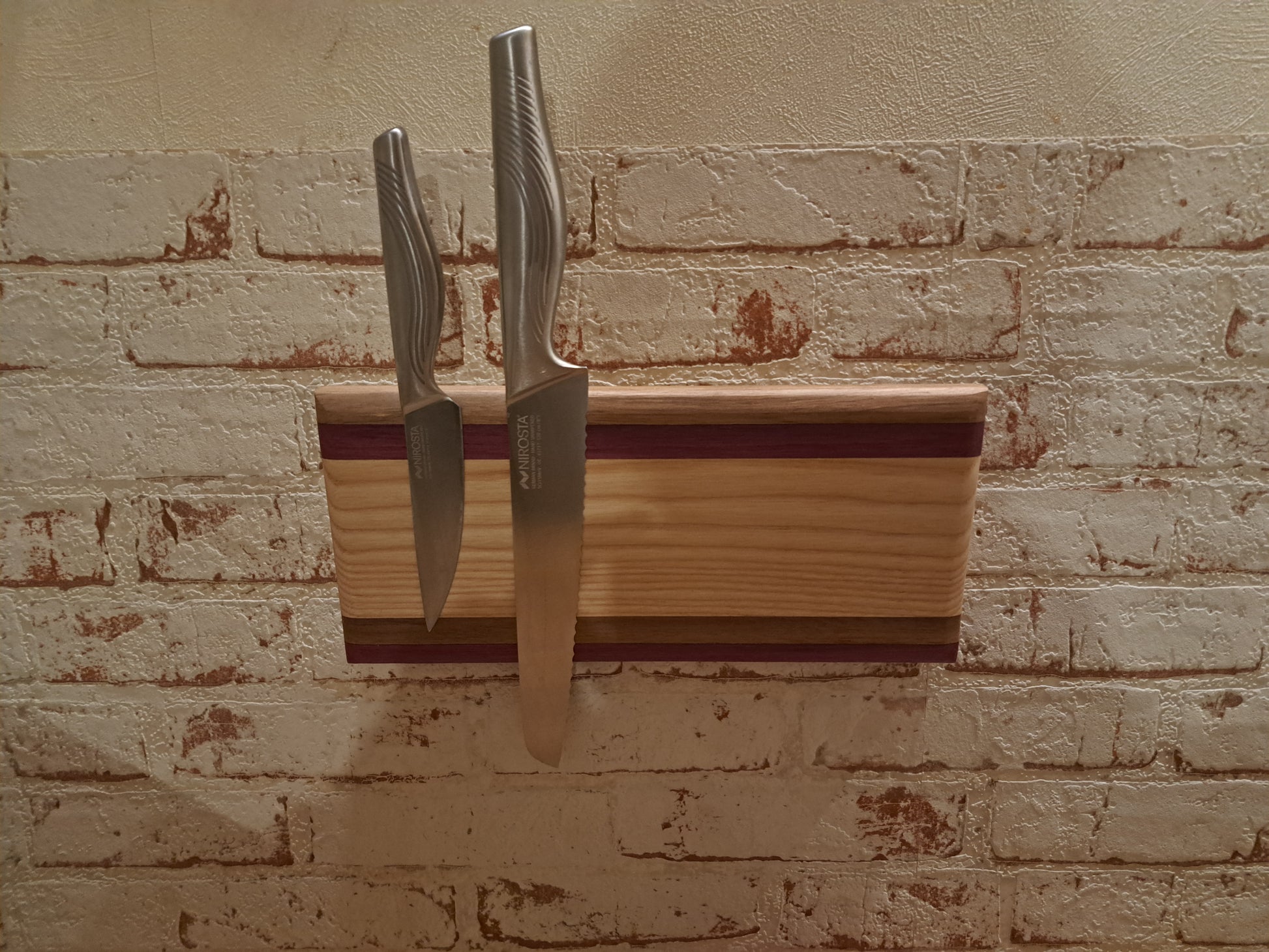 Messerleiste aus Esche, Walnuss und Amaranthholz mit neodym Magneten