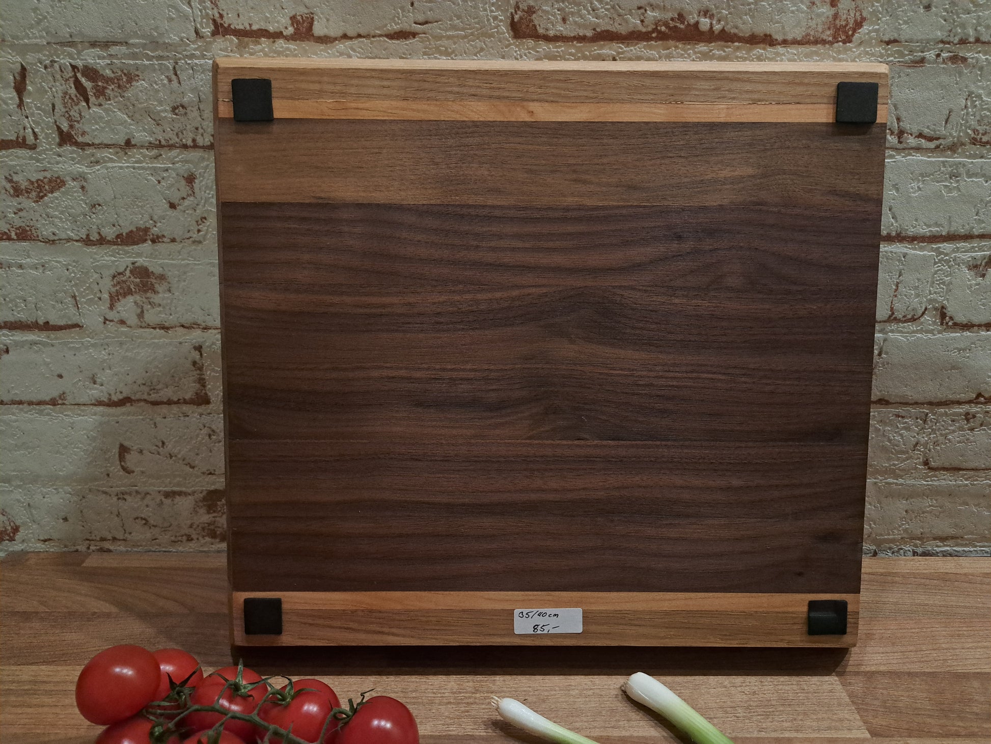 Schneidebrett mit den Maßen ca 37cmx34cmx3,5cm aus amerikanischer Blacknut Schwarznuss, heimischer Eiche und Kirsche.