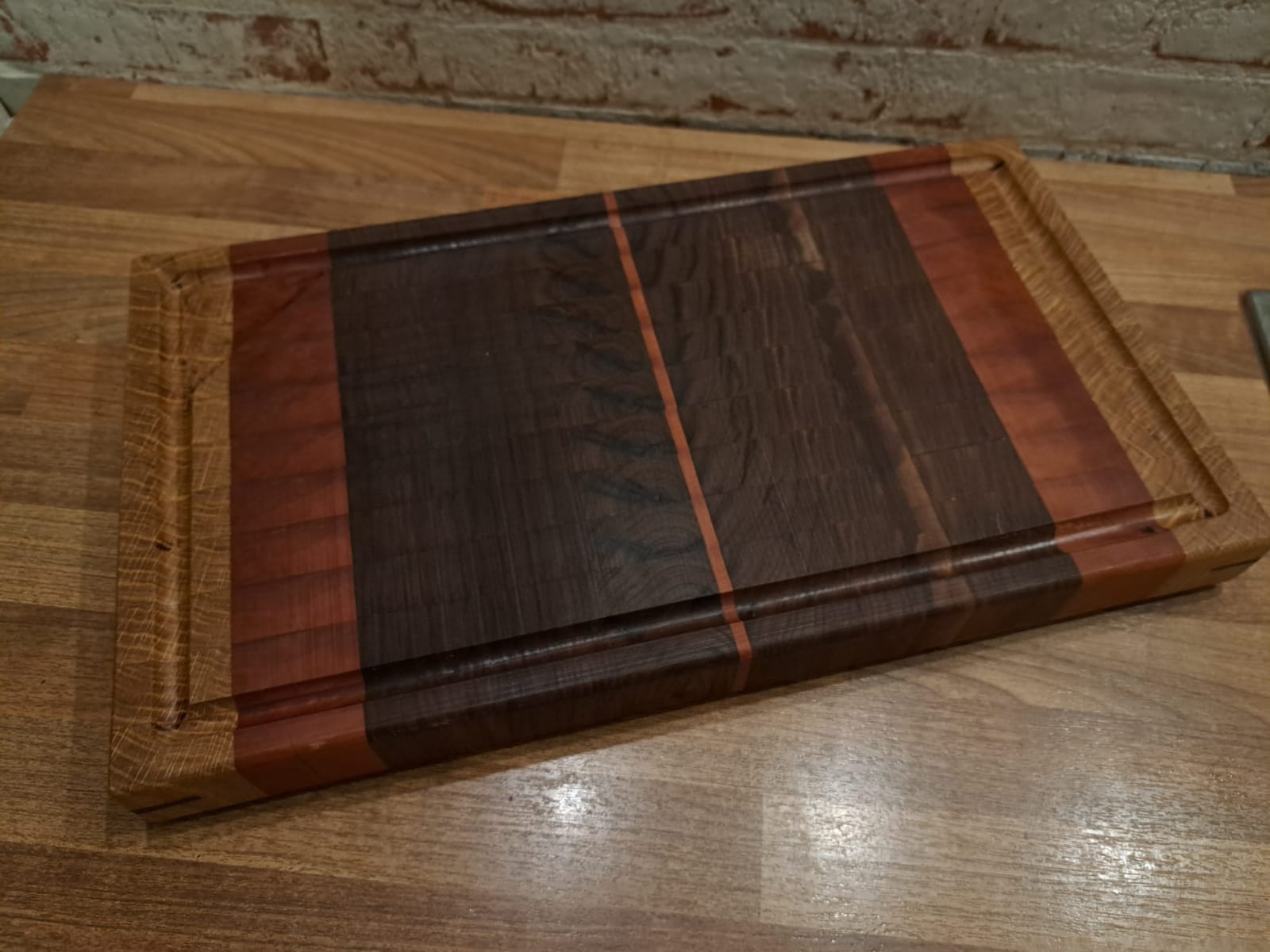 Ein Stirnholzbrett aus Eiche, amerikanischer Black-Nut Walnuss und gedämpfter Birne, mit Saftrinne.