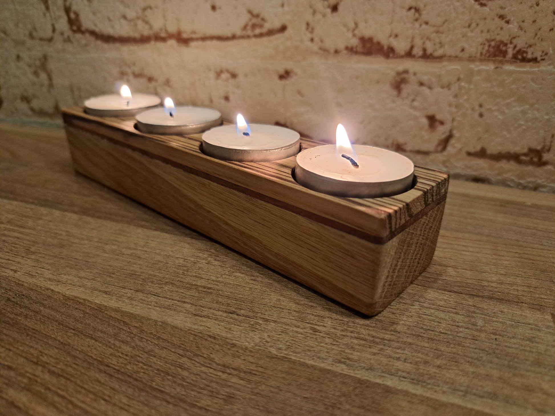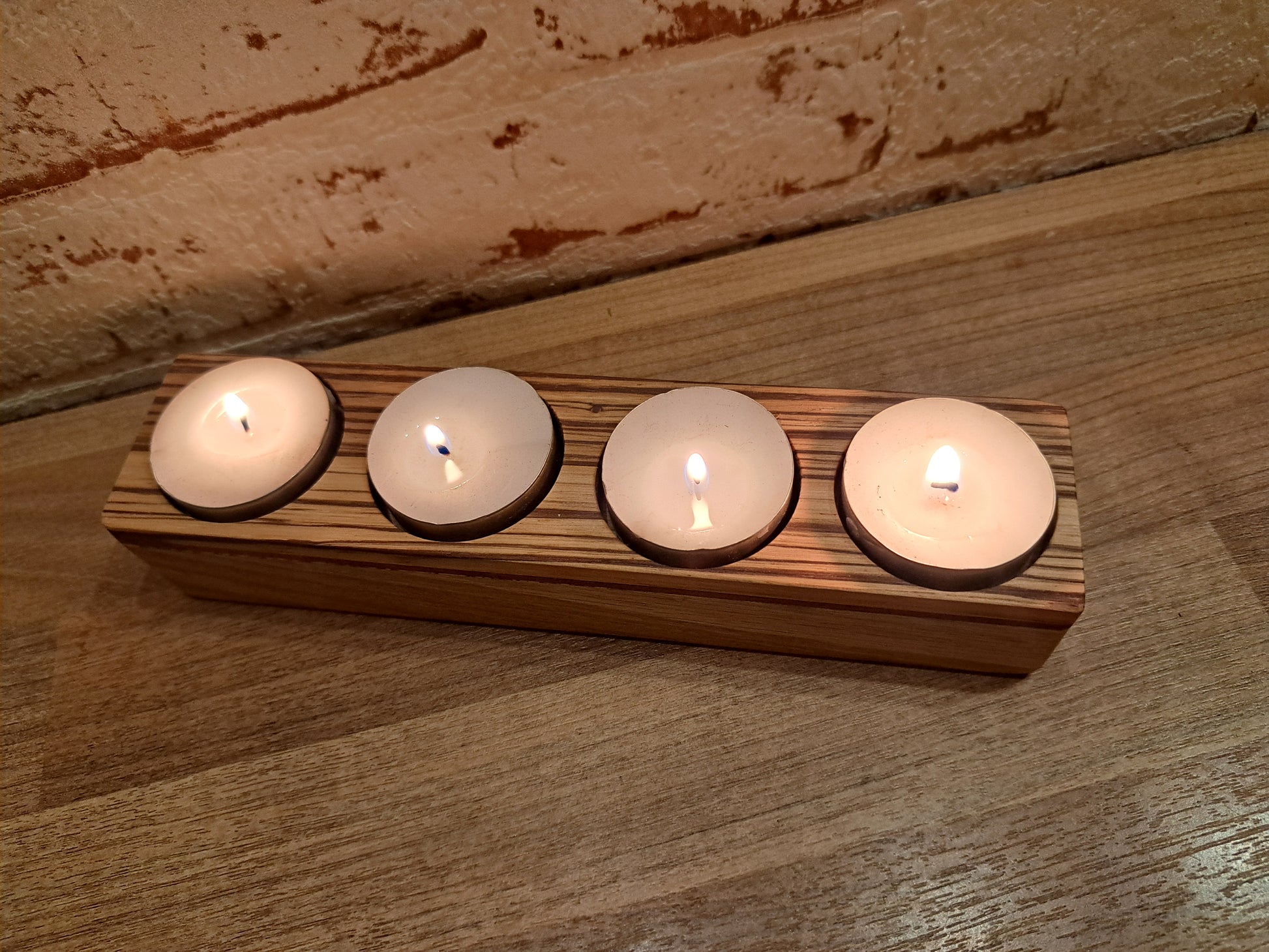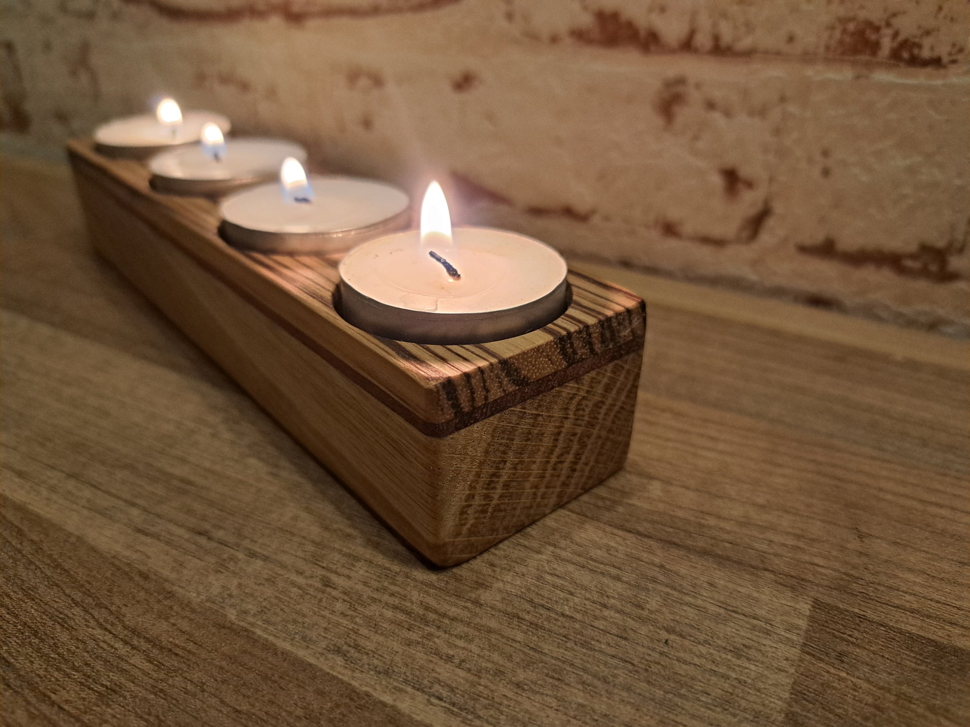 Teelichthalter mit Platz für 4 Teelichter aus Zebrano, Padouk und Eiche
