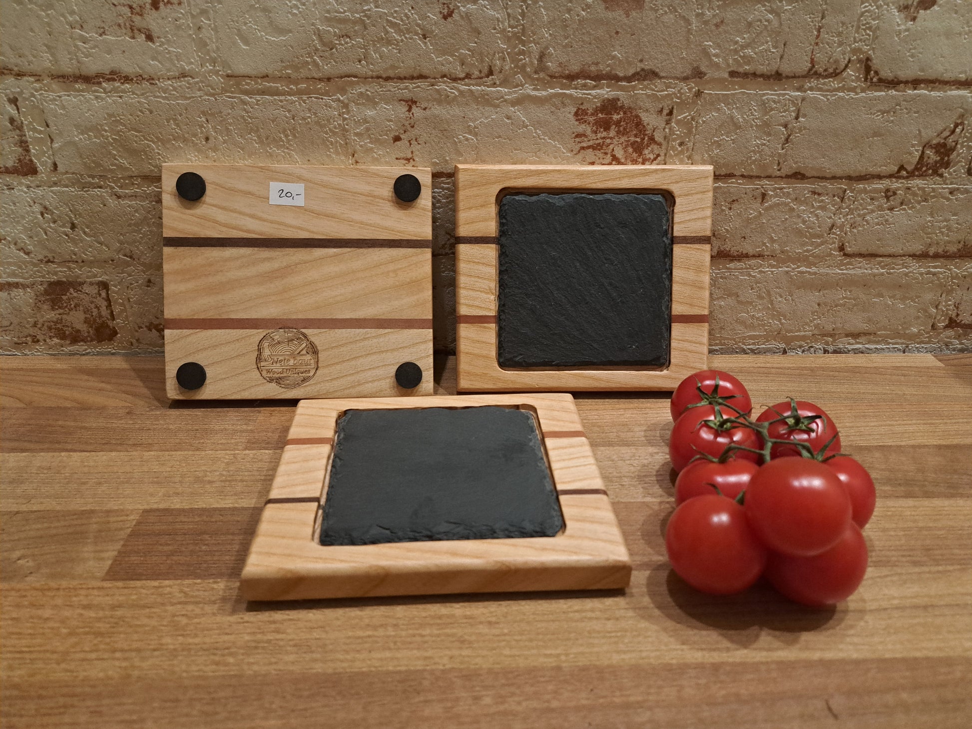 Topfuntersetzer mit einer Schieferplatte aus Esche und Akzente aus Walnuss und Birne